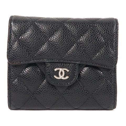 CHANEL黑色菱格荔枝皮 銀扣三折短夾