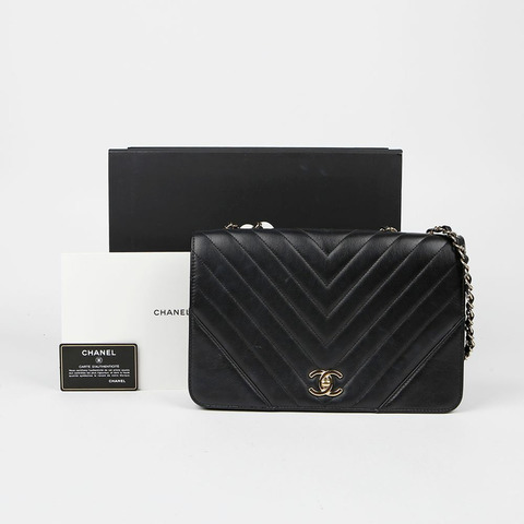 CHANEL Matelasse W 翻蓋鏈條單肩包 羔羊皮 黑色 二手 GHW CC