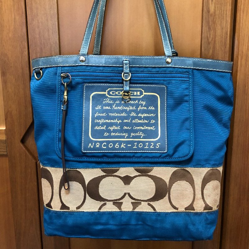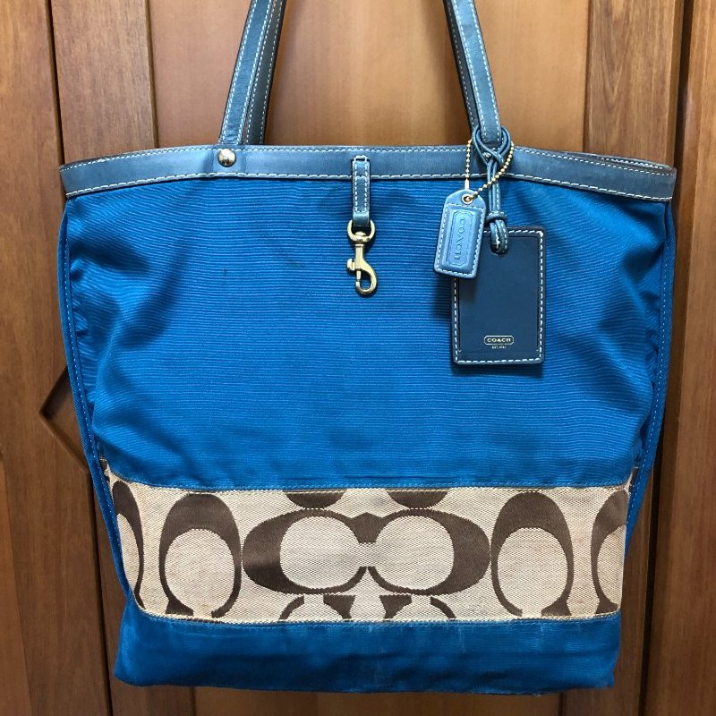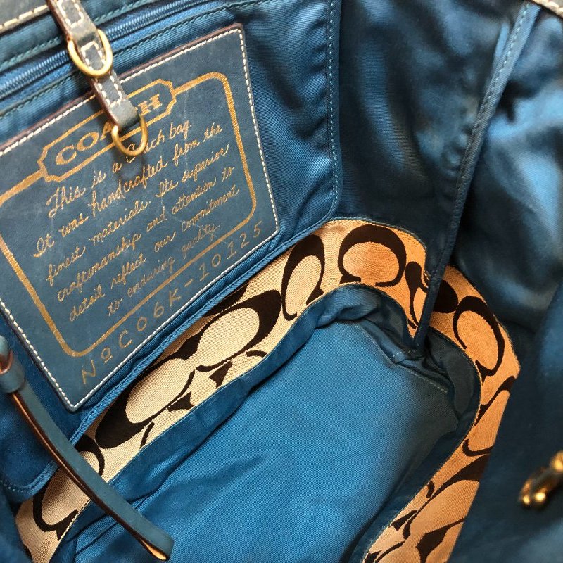 美國正貨,特殊少有的孔雀藍色搭配經典褐色老花,雙面可用。 尺寸可參考照片圖示,內裡乾淨,皮革有常態使用痕跡。