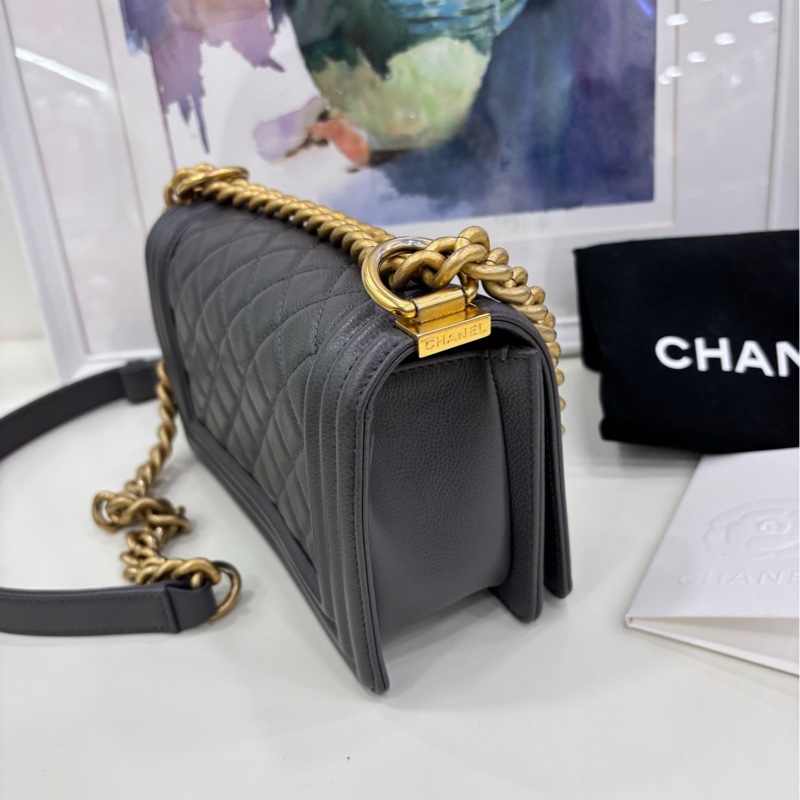 CHANEL香奈兒 Leboy 22A深灰色金扣荔枝紋牛皮肩背包 晶片款 有購證 尺寸20.5*8.5*12cm~