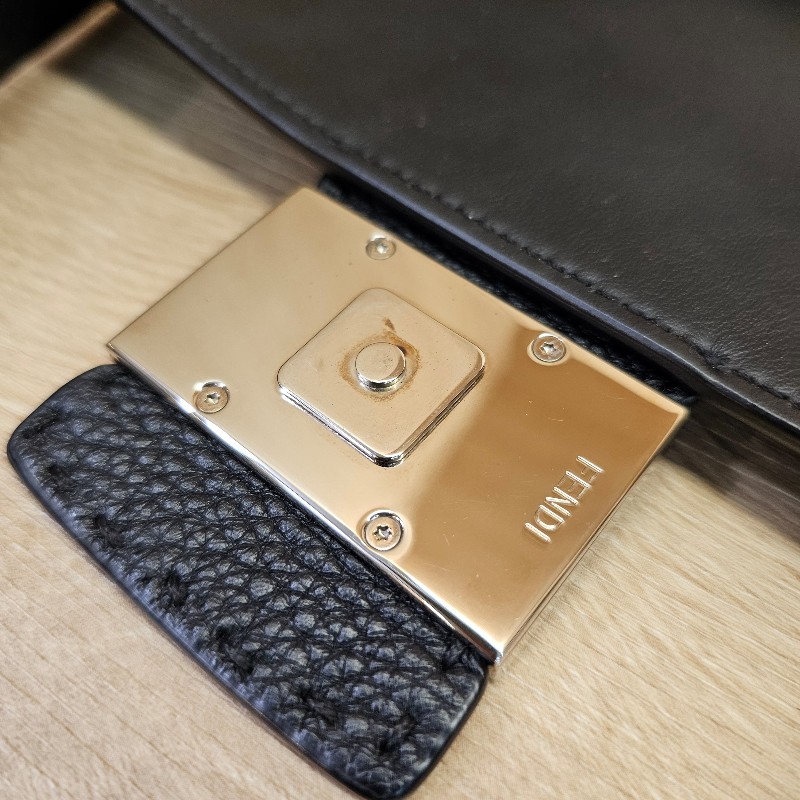 高標準整體88成新 磁吸釦金屬使用刮傷痕跡(如圖) 皮革輕微使用痕跡 無明顯或是大面積刮傷 內裡乾淨 [ 本人只買正品放心購買,平台也會幫妳鑑定過後才寄出 ] Baguette 資訊: Fendi官方型號 7VA524 長寬高 22*3*17 cm 配件: Fendi防塵袋 經典的FF Logo 品牌特色鮮明 黑色全皮款質感低調 那看程度滿分❣️ 容量好裝! #Fendi#Baguette#斜背包#女包#男包