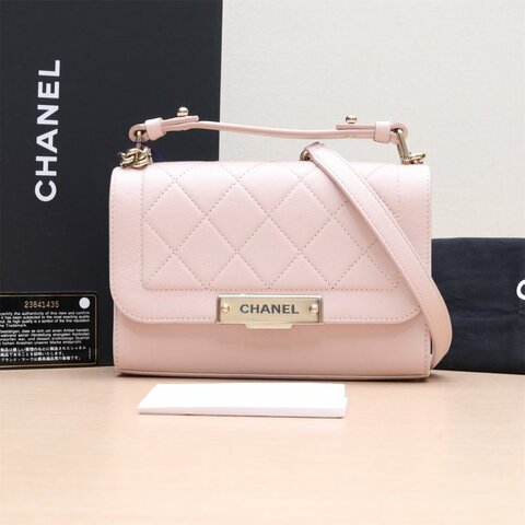 CHANEL粉色大logo荔枝紋牛皮 馬鞍包