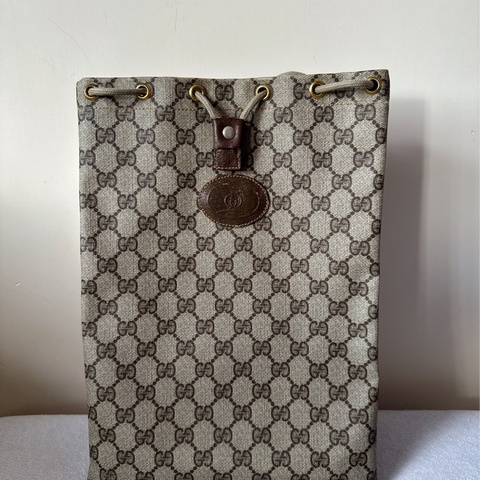 GUCCI 舊款 Gucci GG plus 抽繩包 97 19 302 帆布皮革米色棕色二手
